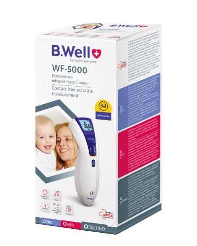 در ادامه تب سنج را به آرامی به سمت پیشانی حرکت داده و عقب آورده تا فاصله مناسب سنجش دما مشخص شود.در نهایت صدای بوق، نشان میدهد سنجش دما به درستی انجام شده است.ترمومتر بی ول 5000 برای سنجش دمای شیر نوزاد،اندازه گیری دمای بدن کودک هنگام خواب بدون مزاحمت،اندازه گیری دمای اشیاء،آب حمام و سطوح کاربرد دارد.در این تب سنج لیزری،مناسب بودن دما با صورتک خندان و مناسب نبودن آن با ایموجی اخمو نمایش داده میشود.این دستگاه دارای قابلیت اندازه گیری آسان در هنگام شب به خاطر داشتن نور پس زمینه میباشد.