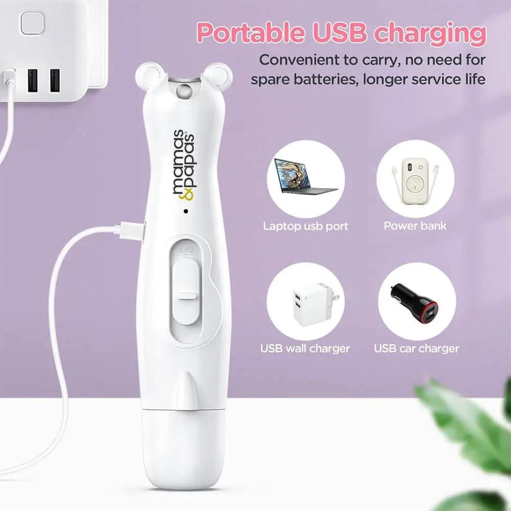 یک چراغ کوچک LED در سر دستگاه تعبیه شده که امکان روشن کردن منطقه ناخن را فراهم میکند. این ویژگی در نور کم یا در هنگام خواب نوزاد بسیار مفید است و به دقت بیشتر کمک میکند.