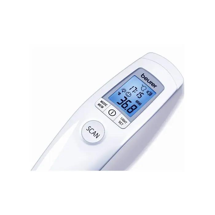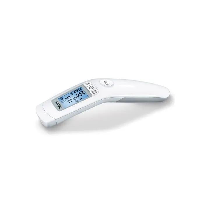 دماسنج و تب سنج رده پزشکی بیورر BEURER مدل FT90 دستگاهی خوش دست و ارگونومی،پیشرفته و مجهز به سنسور مادون قرمز دقیق میباشد که بسیار سریع و آسان با روش اندازه گیری غیر تهاجمی و غیر تماسی با بدن یا اجسام مورد نظر دمای آنها را اندازه گیری کرده و نمایش می دهد. ترمومتر FT90 beurer ساخته شده تا دمای تب (را از ناحیه پیشانی) و شیشه شیر یا ظرف غذای نوزاد و کودک و همچنین دمای محیط و اتاق کودک را اندازه گیری کند.این دستگاه مناسب مصارف خانگی و یا مطب پزشکان برای اندازه گیری سریع و دقیق تب بیماران یا در کلینیک ها یا بیمارستان ها بوده و برای اندازه گیری دمای پیشانی، اجسام و محیط کاربرد دارد. محدوده دمای قابل اندازه گیری توسط دستگاه برای پیشانی از 34 تا 42.2 و برای اجسام از 22- تا 80 درجه سانتیگراد با دقت 0.2-0.3 درجه ای می باشد. به دلیل اندازه گیری غیر تماسی در این روش کنترل آلودگی بیماریهای مسری موجود در محیط بسیار ایزوله و ایمن و بهداشتی بوده و حتی می توان برای اندازه گیری دمای شیر یا غذای کودکان و یا آب حمام نیز آن را مورد استفاده قرار داد. منبع تغذیه این ترمومتر دو باتری نیم قلمی 1.5 ولت است که همراه با آن در بسته بندی اصلی تحویل داده میشود و همچنین جهت صرفه جویی در مصرف باتری دستگاه مجهز به سیستم خاموشی خودکار نیز می باشد. ترمومتر مادون قرمز FT90 BEURERبیورر کمک می کند تا در صورت وجود تب که یکی از علایم رایج بروز بیماری و عفونت در بدن می باشد آگاهی پیدا کنیم و اقدامات لازم در جهت رفع آن را در اسرع وقت انجام دهیم. تب سنج بیورر مدل FT90 به دلیل داشتن سنسور مادون قرمز به صورت غیر تماسی با فاصله 2 تا 3 سانتی متری و با سرعت عملکرد بالایی که دارد طی کسری از ثانیه دما را اندازه گیری کرده و نمایش میدهد.پنل دستگاه شامل نمایشگر و 4 کلید کنترلی است که جهت انجام تنظیمات دستگاه، حافظه، تغییر در واحد اندازه گیری و شروع به کار آن میباشد. نشانگرهای هشدار دهنده قابل نمایش عبارتند از نمایش علایم مربوط به دمای اجسام، دمای محیط، دمای پیشانی، قابلیت فعال بودن صدای دستگاه،قابلیت تنظیمات مربوط به تاریخ و زمان، قابلیت نمایش دمای اندازه گیری شده، نمایش نماد داشتن یا نداشتن تب، اتمام باتری، واحد اندازه گیری دما برحسب درجه سانتی گراد و فارنهایت می باشد. این تب سنج دارای 60 جایگاه حافظه برای ذخیره مقادیر اندازه گیری شده است، همچنین پس از استفاده از دستگاه می توانید وسیله را جهت جلوگیری از آسیب دیدگی و آلوده شدن درون قاب محافظ پلاستیکی تعبیه شده برای آن قرار دهید.