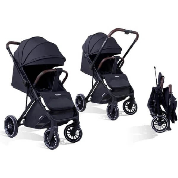 کالسکه مسافرتی با قابلیت رو به مادرشو، جمعشدن به صورت چمدانی، تحمل وزن زیاد، با دسته دوطرفه بسیار راحت با یک دکمه، مجهز به سایبان بزرگ، پنجره دید مادر و سبد لوازم در زیر کالسکه، دارای کمک فنر چرخهای جلو و عقب.