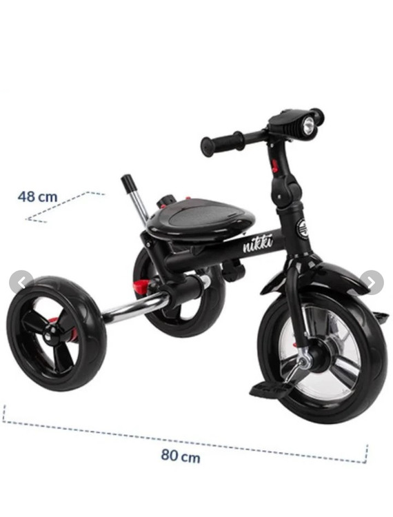 سه چرخه کودک تاشو با سایبان کیکابو مدل Nikki هر آنچه را که برای لذت بردن از هر پیاده روی نیاز دارید در اختیار شما قرار می دهد. دارای چراغ جلو و جلوه های صوتی است که به کودک شما احساس یک راننده واقعی می دهد. این سه چرخه کودک پدالی با سایبان گزینه ای مناسب برای بازی کودکان بالای 12 ماه می باشد، دارای قابلیت چرخش صندلی رو به مادر و دارای کمربند ایمنی با 3 نقطه مهار است. همچنین دارای جا پایی با قابلیت جمع شدن میباشد. بدنه این سه چرخه کودک فلزی می باشد.چرخ های این سه چرخه کودک ازجنس EVA هستند، نیازی به باد ندارند. این محصول دارای ترمز چرخ عقب و دکمه ای برای قفل حرکت پدال هاست.
