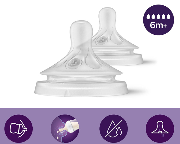 خرید سر شیشه شیر avent شماره 5 قطره جدید اونت آخرین گام برای جریان شیر پس از سرشیشه 4 قطره است این سرشیشه طبق توصیه اونت برای بیشتر از 6 ماهگی می تواند مورد استفاده قرار بگیرد اما برای همه کودکان نمیتوان یک زمان مشخص برای شروع استفاده از این سایز اعلام کرد چون سرعت رشد نوزادان با هم متفاوت است . این امر به تجربه مادر از شیرخوردن کودک اش بر میگردد که بهترین زمان انتخاب این سایز وقتی است که سرشیشه شماره 4 ریسپانس استفاده شده و دیگر برایش کم بود موقع انتقال به این سرشیشه است